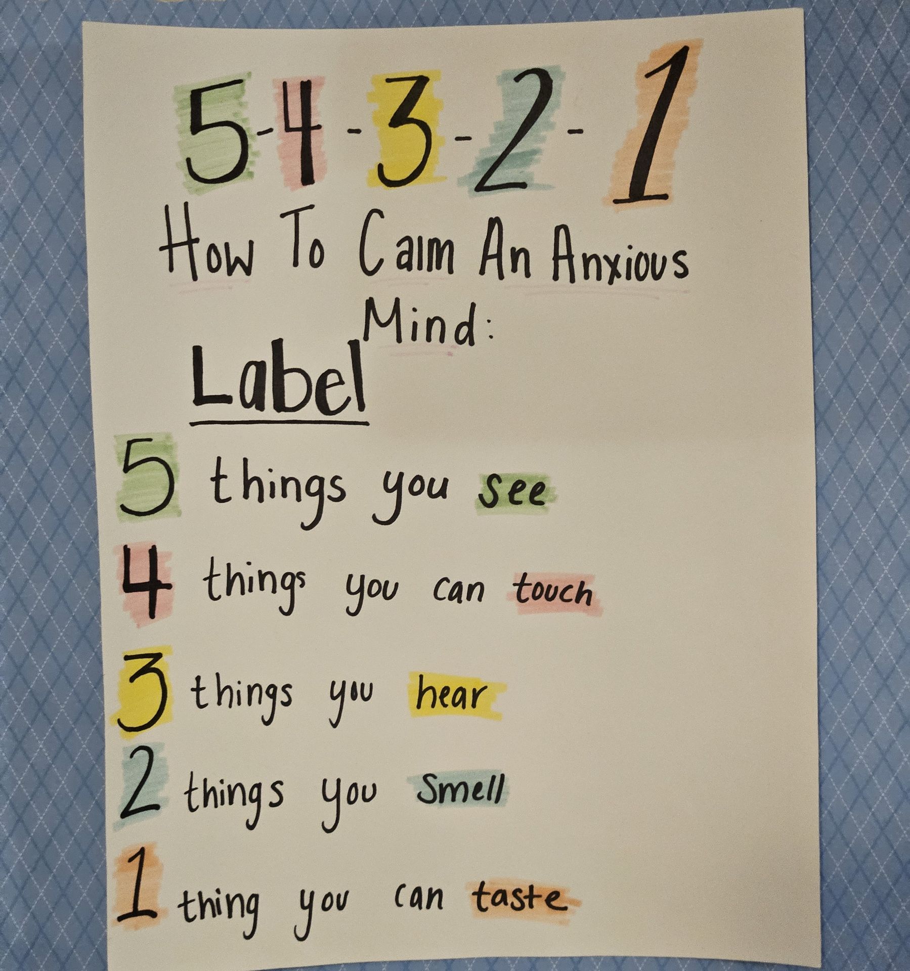 5-4-3-2-1 is a grounding technique which is a coping strategy used to help people reconnect with the present moment and detach from overwhelming or distressing thoughts, feelings, or sensations.