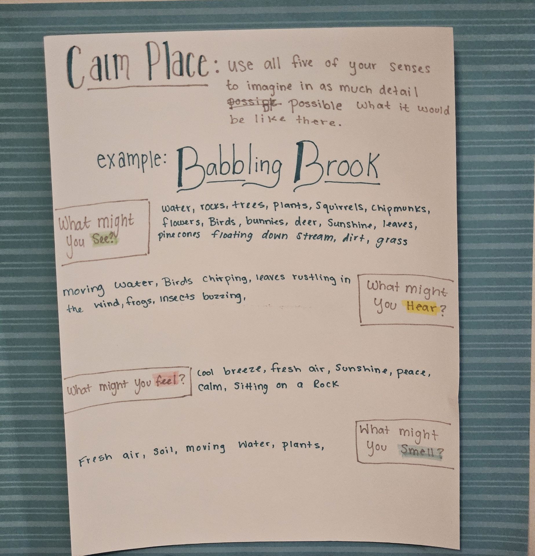 Calm Place, sometimes referred to as Safe Space is a visualization technique for managing anxiety, stress, or overwhelming emotions by mentally bringing oneself to a calm or safe place. The goal is to create a vivid mental image of a relaxing, peaceful place. This technique allows individuals to temporarily escape the stressful or distressing situation.