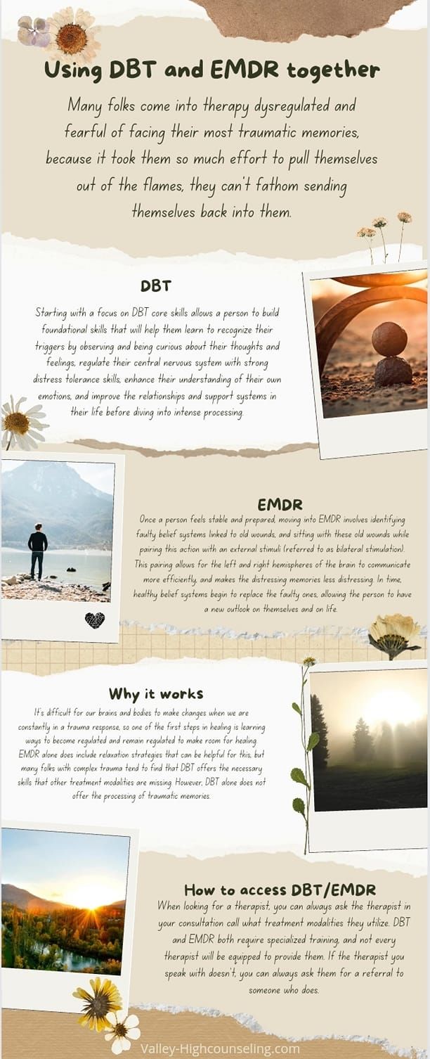 After training in DBT, I integrated it into my trauma work. DBT provides the structure and skills many clients need to feel safe and stable while processing difficult experiences. Combining DBT with EMDR allows clients to move through trauma in a way that is trauma-informed, neurodivergent-affirming, and paced to their needs.